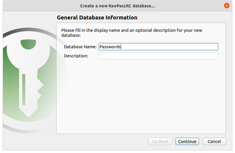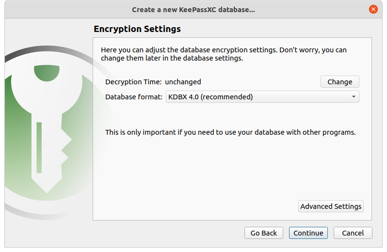 Next, you may choose how long should the decryption of your database take. However, please keep in mind that, as it is written in that window, Higher values offer more protection, but opening the database will take longer. Leave the default database format and click Continue. You will now see the following window: