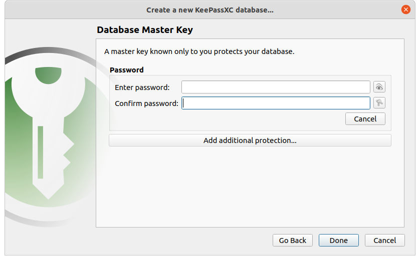 Now you need to provide the password for decrypting your database. Enter it again in the second text field. You can also add additional security measures using the button Add additional protection…, but if you are just getting started in might not be needed.
