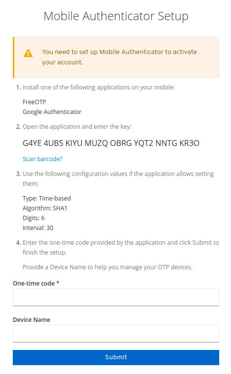 Type your 6-digit code from the above window to the text field One-time-code on the connectVM Cloud website and choose how you would like to call your device containing the TOTP key. Please make sure that you do it before that key expires. If the key expires, you will get another one and you should type it instead. Click Submit. You should now be able to proceed with your login process.