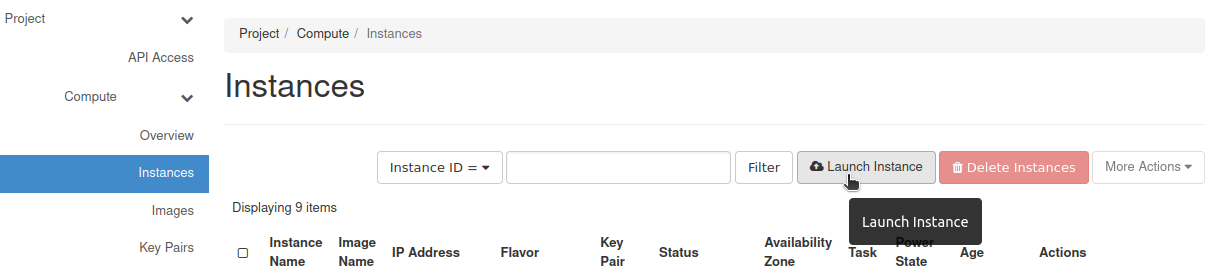 In the Horizon dashboard, navigate to Compute -> Instances. Click the Launch Instance at the top of the Instances section: