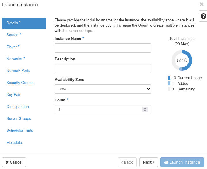 Other steps from the Launch Instance window are optional. Once you have done the previous steps of this article, click Launch Instance button: