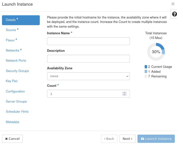 Creation of a virtual machine is divided into 11 sections, four of which are mandatory (denoted by an asterisk in the end of the name of the option). In addition to those four (Details, Source, Flavor, and Networks), we shall define Security Groups and Key Pairs. The rest of the options to launch an instance is out of scope of this article.