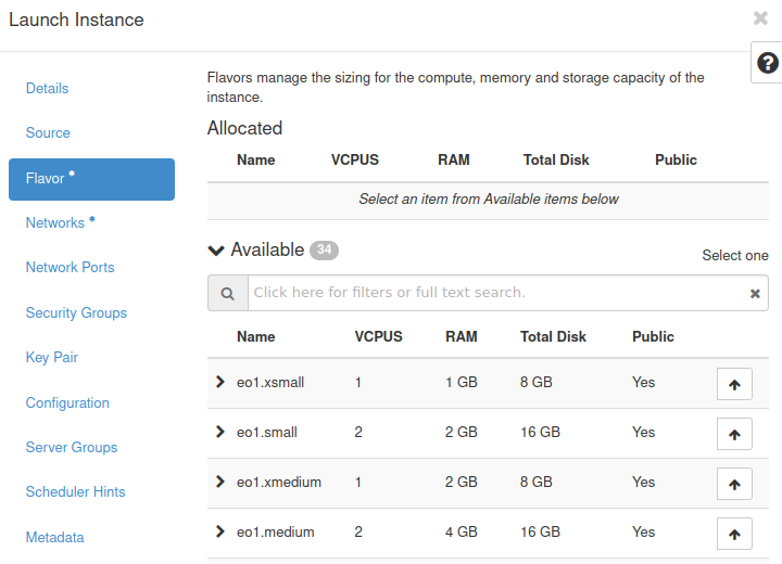 - Instance flavor (the combination of CPU, memory and storage capacity)
