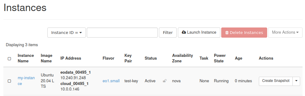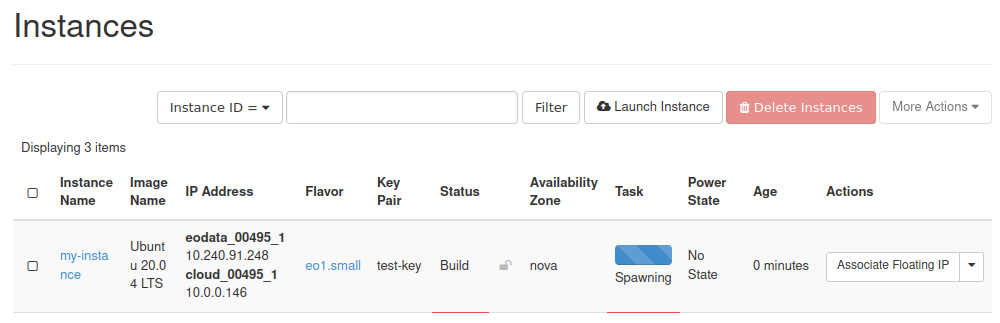 Wait up to a few minutes until your instance has finished spawning. The next state is Running label in the Power State column: