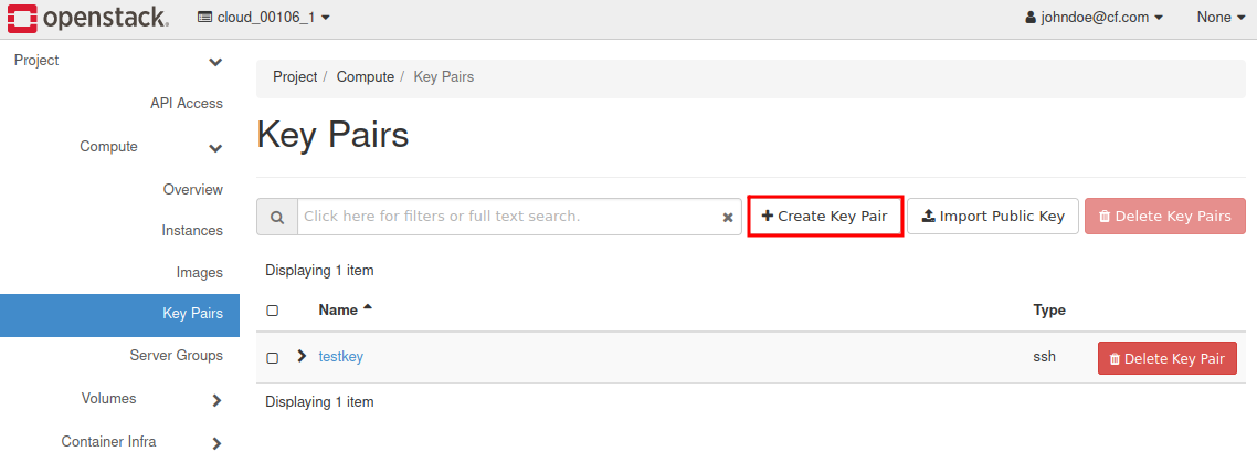 Click Create Key Pair, insert the name of the key (eg. “ssh-key”) and Key Type.