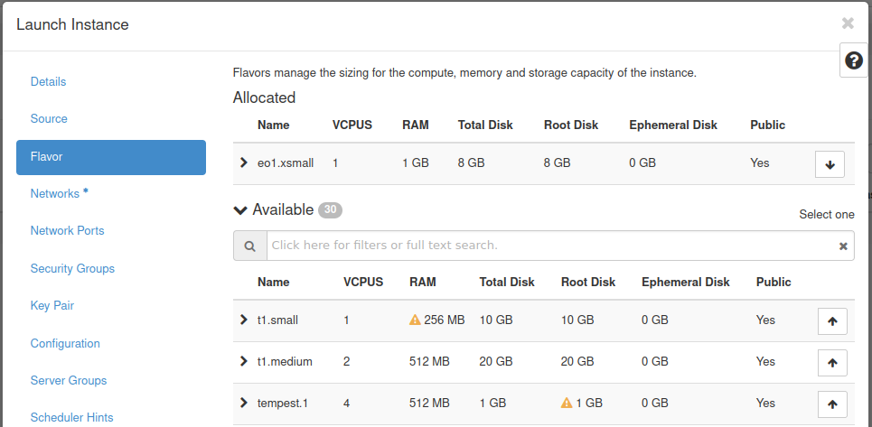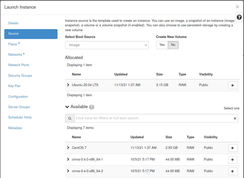 Select Instance Boot Source (eg. “Image”), and choose desired image (eg. “Ubuntu 20.04 LTS”) by clicking on arrow.