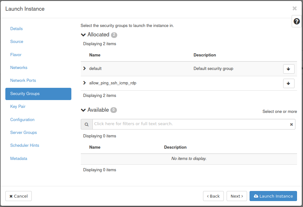 Open “Security Groups” After that, choose “default” and “allow_ping_ssh_icmp_rdp” groups.