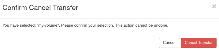To cancel transfer, simply click Cancel Transfer in the row representing your volume, column Actions: