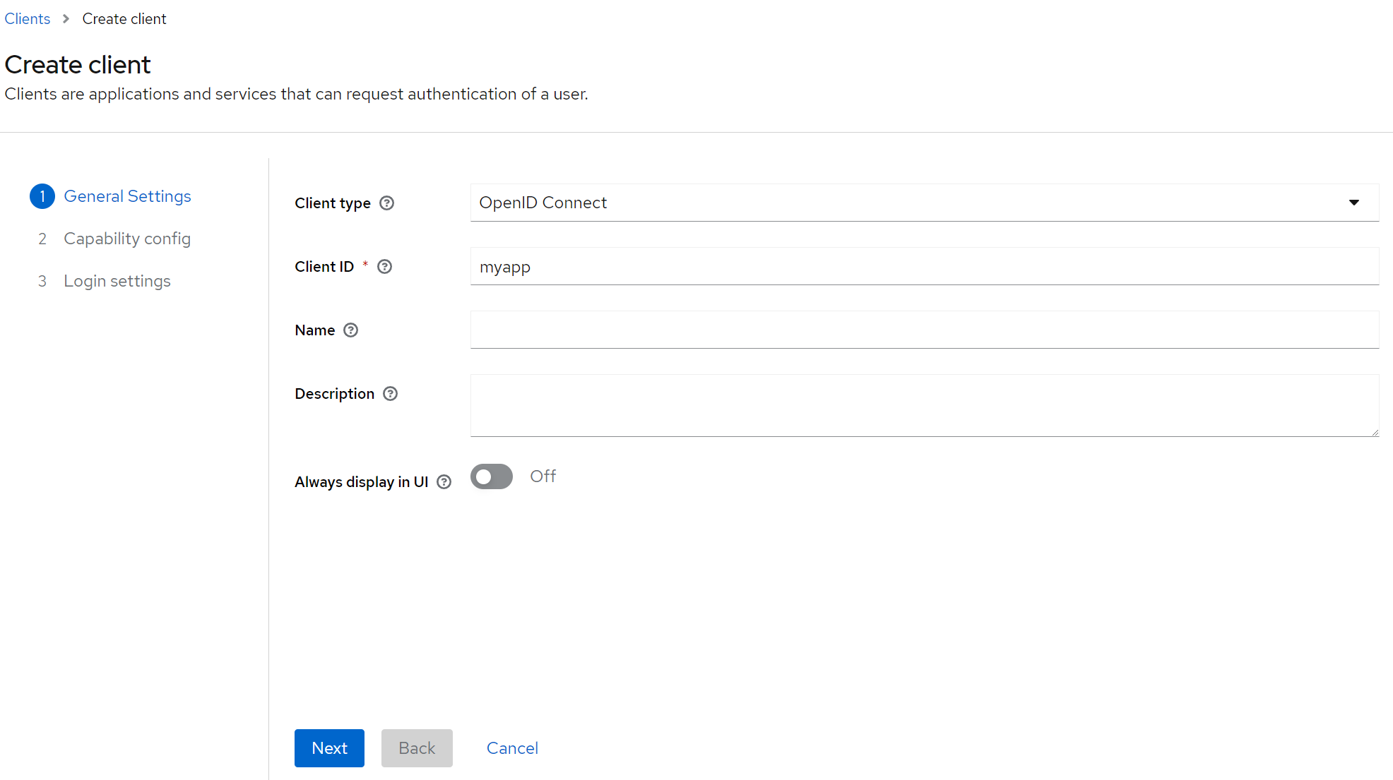 You will enter a wizard consisting of 3 steps. In the first step we just enter the ID of the client (which, in our case, is myapp), leaving other settings unchanged:
