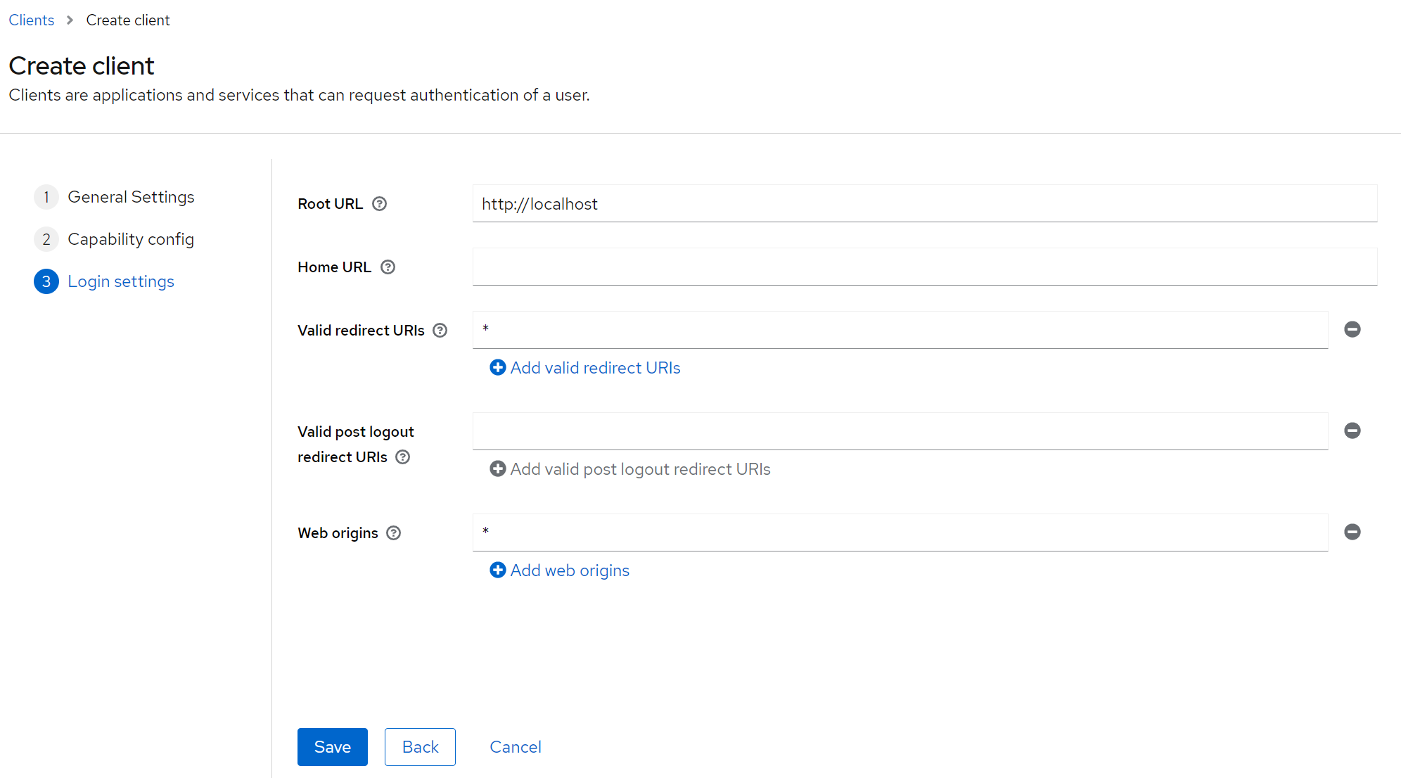 - This setting represents a route in our app, to which a user will be redirected after a successful login from Keycloak. In our case, we leave this setting very permissive with a “*”, allowing redirect to any path in our application. For production, you should make this more explicit, using a dedicated route, say, /callback, for this purpose.