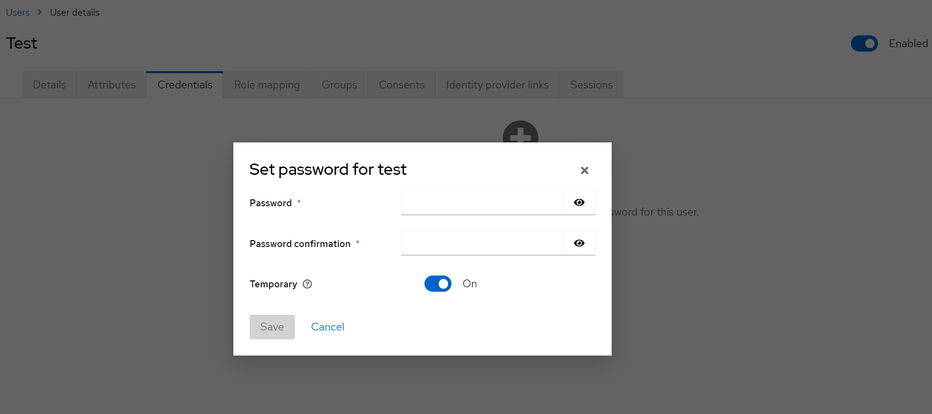Next, we will set up password credentials for the newly created user. Select Credentials tab and then Set password, type in the password with confirmation in the form and hit Save: