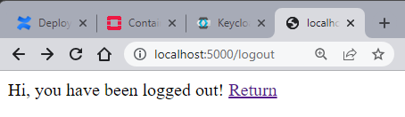 The last route to test is /logout . When entering localhost:5000/logout to the browser, we can see the screen below. Entering this route calls the flask-oidc method that logs the user out, also clearing the session cookie under the hood.