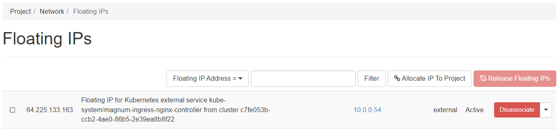 When you deployed your cluster with NGINX ingress, behind the scenes a LoadBalancer was deployed, with a public IP address exposed. You can obtain this address by looking it up in the Horizon web interface. If your list or floating IPs is longer, it can be easily recognized by name:
