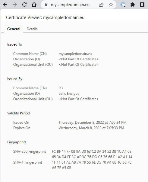 If all works well, the effort is complete and after a couple of minutes we should see the lock sign in front of our IP address. The service is now HTTPS-secured, and you can verify the details of the certificate by clicking on the lock icon.