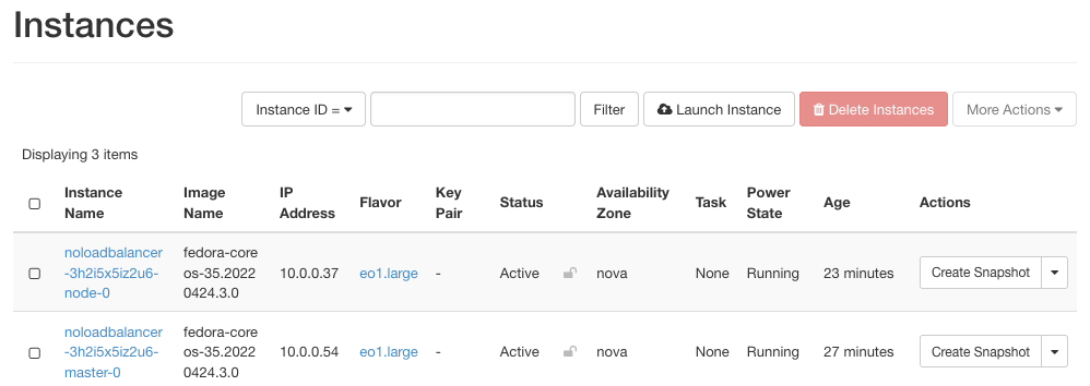 Now back to Horizon interface and execute commands Compute -> Instances to see the addresses for master node of the NoLoadBalancer cluster: