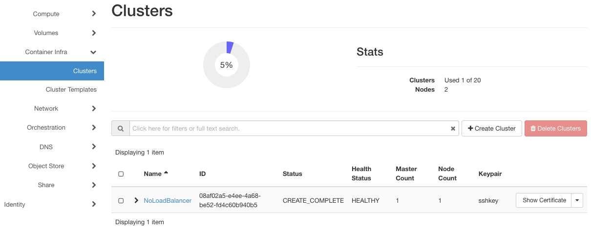 The article How to Create a Kubernetes Cluster Using connectVM Cloud connectVM Magnum shows creation of clusters with Horizon visual interface. (In this article, you shall use it to create an exemplar cluster called NoLoadBalancer.)