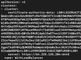 So, open the config file using nano (or other text editor of your choice). Swap 10.0.0.54 for 64.225.135.112 in line for server access. The address 64.225.135.112 is the address of the floating IP for master node and will fit in perfectly.