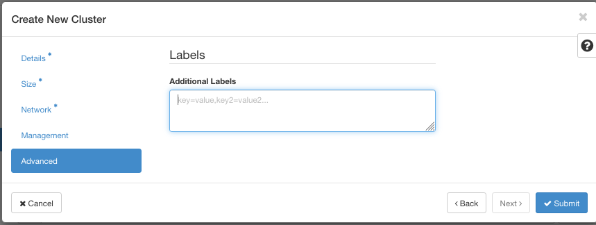 Labels can change how the cluster creation is performed. There is a set of labels, called the Template and Workflow Labels, that the system sets up by default. If this check box is left as is, that is, unchecked, the default labels will be used unchanged. That guarantees that the cluster will be formed with all of the essential parameters in order. Even if you add your own labels, as shown in the image above, everything will still function.