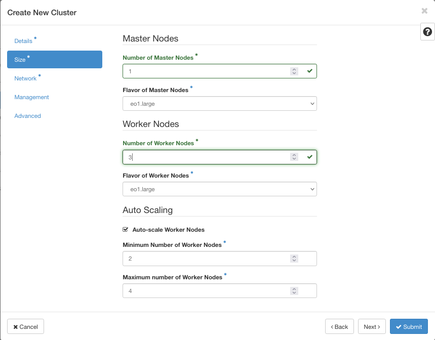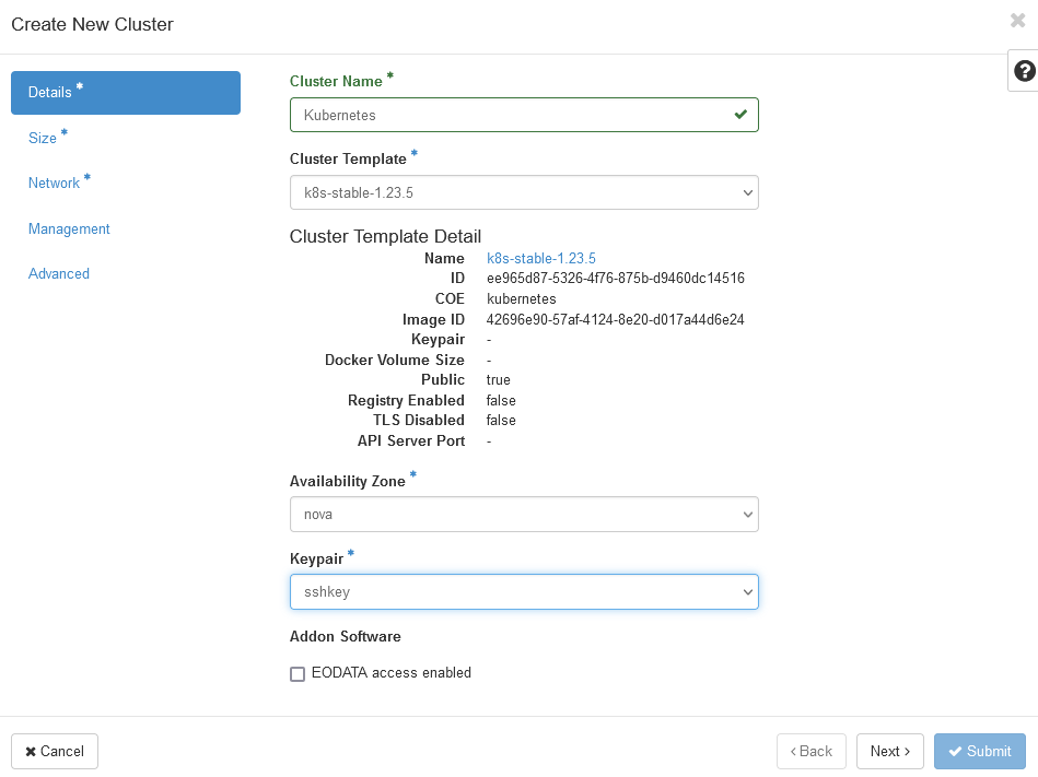 On the left side and in blue color are the main options – screens into which you will enter data for the cluster. The three with the asterisks, Details, Size, and Network are mandatory; you must visit them and either enter new values or confirm the offered default values within each screen. When all the values are entered, the Submit button in the lower right corner will become active.