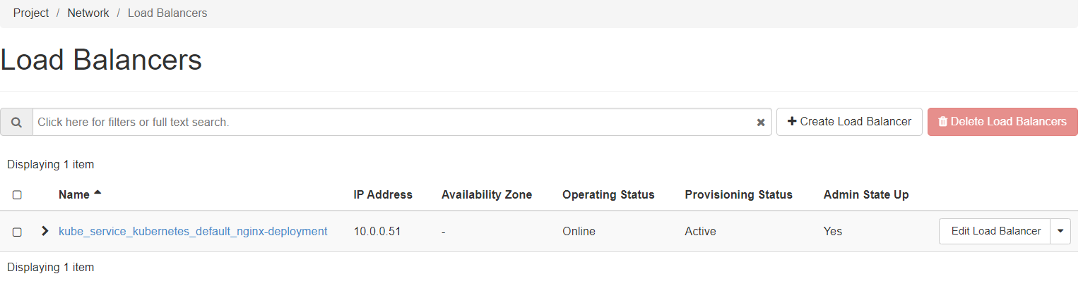 Similarly, you could verify the presence of the created load balancer in the Horizon interface via the left menu: Project → Network → LoadBalancers