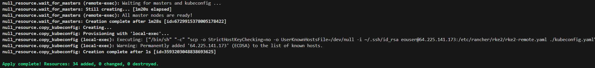 The provisioning will take a few minutes (apx. 5-10 minutes for a small cluster). Logs will be printed to console confirming creation of each resource. Here is a sample final output from the terraform apply command: