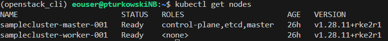 We can see that the cluster is provisioned correctly in our case, with both master and worker nodes being Ready: