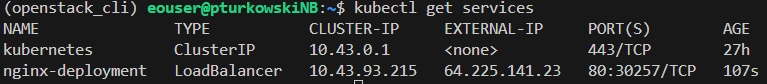 We can verify the automated provisioning of load balancers and public Floating IP by exposing a service of type LoadBalancer. The following kubectl commands will deploy and expose an nginx server in our RKE2 cluster’s default namespace: