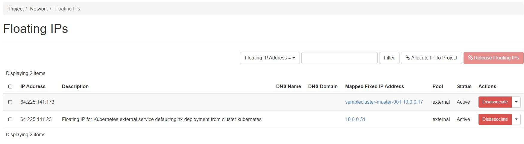 and Project → Network → Floating IPs: