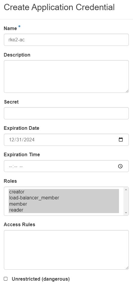 The next step is to create an application credential that will be used to authenticate the connectVM Cloud Controller Manager (used for automated load balancer provisioning). To create one, go to menu Identity → Application Credentials. Fill in the form as per the below example, passing all available roles (“member”, “load-balancer_member”, “creator”, “reader”) roles to this credential. Set the expiry date to a date in the future.