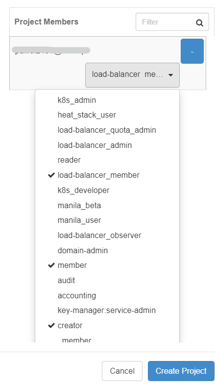 In the second tab, ensure that the user you operate with is added as a project member with: “member”, “load-balancer_member” and “creator” roles.