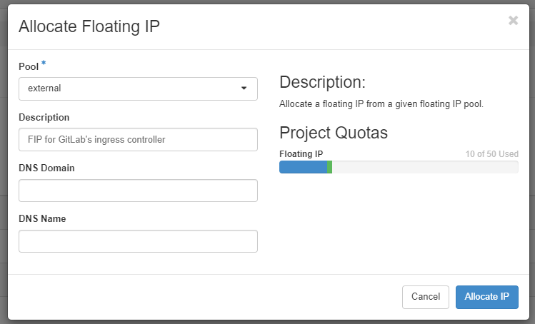 We will first create a Floating IP (FIP) using Horizon GUI. This FIP will be later associated with the ingress controller. To proceed go to Network tab, then Floating IPs and click on Allocate IP to project button. Fill in a brief description and click Allocate IP.
