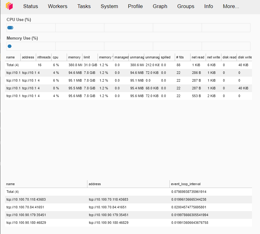 Similarly, with the Scheduler Dashboard, paste the floating IP to the browser to view it. If you then click on the “Workers” tab above, you can see that 4 workers are running on our Dask cluster: