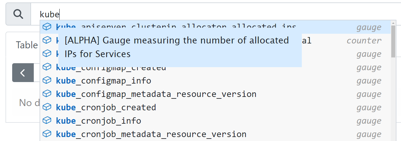 Notice, when you start typing kube in the search results, the autocomplete suggest some of the metrics that are available from our Kubernetes cluster. Along with the Helm chart installation, these metrics got exposed to Prometheus, so they are stored in Prometheus database and can be queried for.