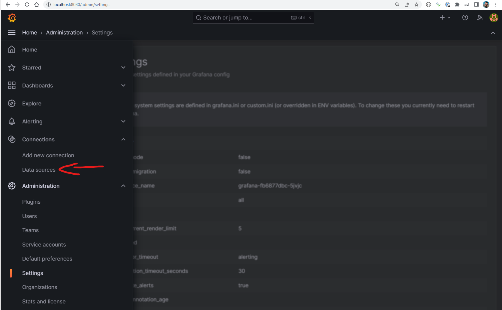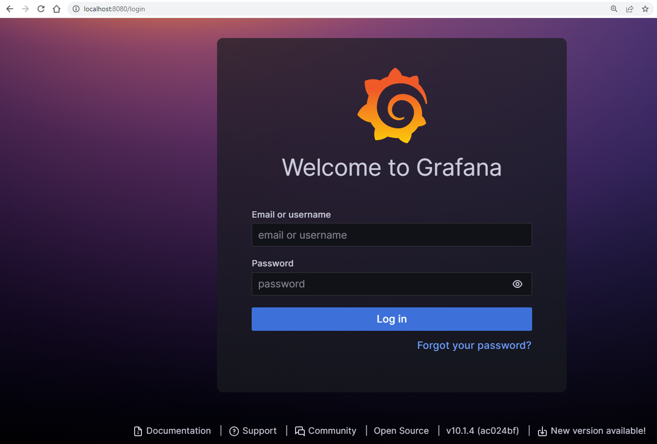 Then access the Grafana dashboard by entering localhost:8080 in the browser: