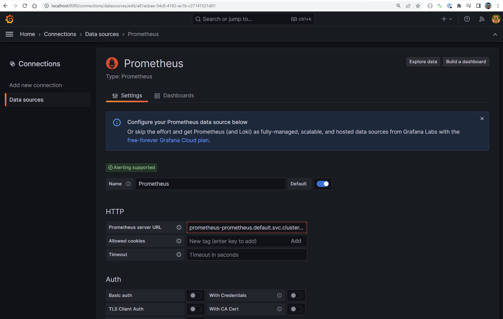 Just change “Prometheus server URL” field to http://prometheus-kube-prometheus-prometheus.default.svc.cluster.local:9090 which represents the address of the Prometheus Kubernetes service in charge of exposing the metrics.