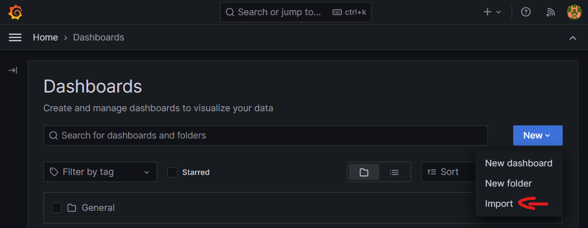 To proceed, select the Dashboards section from the collapsible menu in top left corner and click Import:
