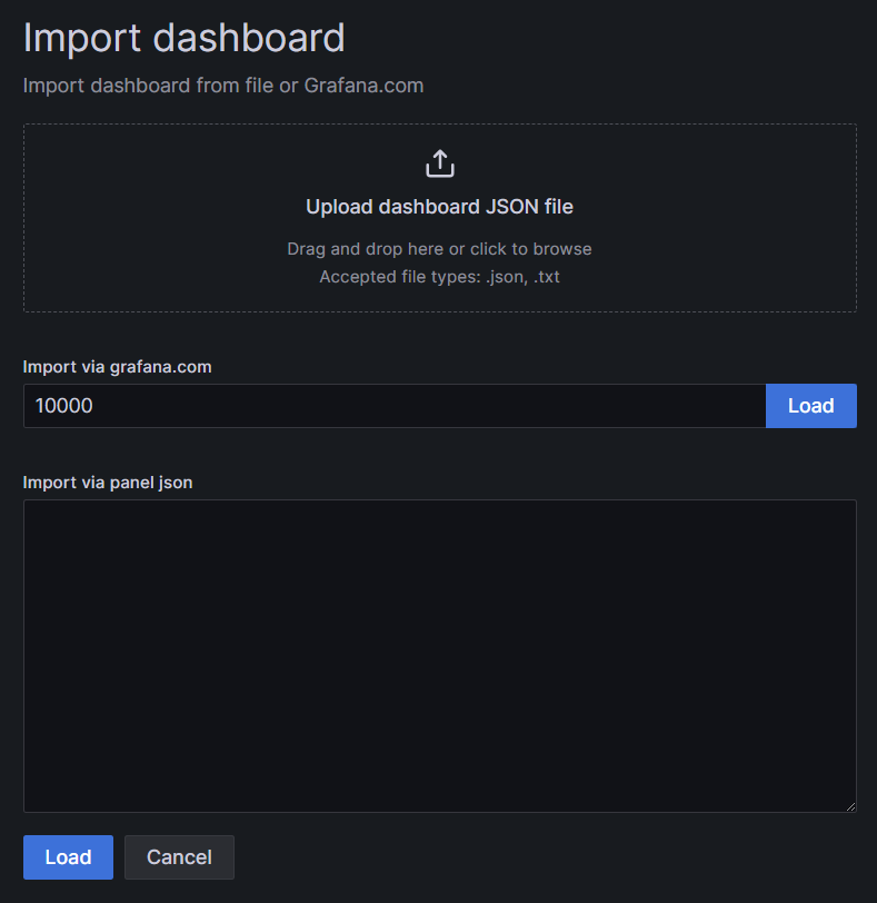Then in the import via grafana.com field, enter 10000, which is the ID of the Kubernetes observability dashboard from the grafana.com marketplace represented in: https://grafana.com/grafana/dashboards/10000-kubernetes-cluster-monitoring-via-prometheus/