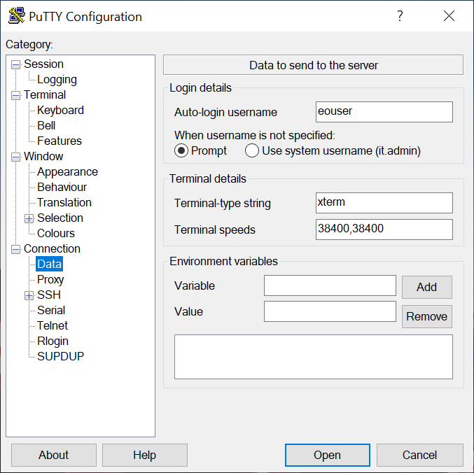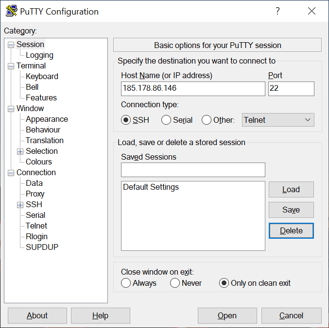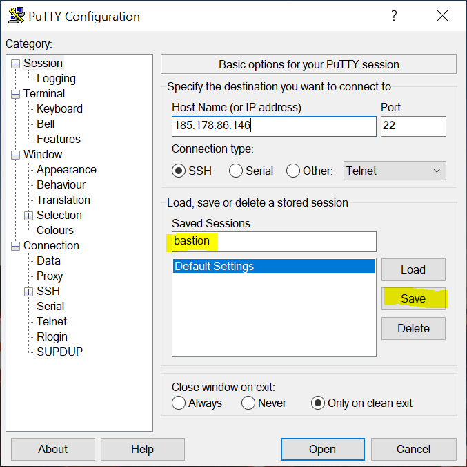 Session tab: Provide the host (bastion) floating IP address and the SSH port (default 22).