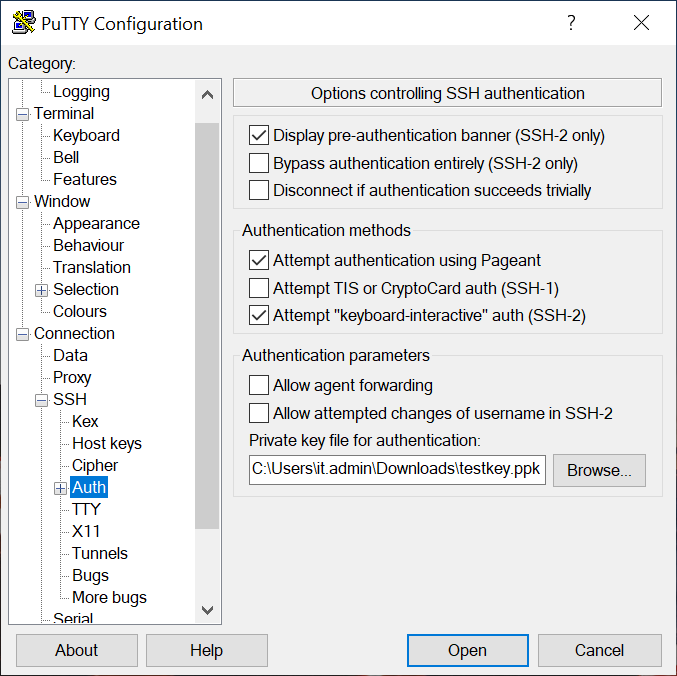 Connection > SSH > Auth tab: Select the private key in the .ppk format.