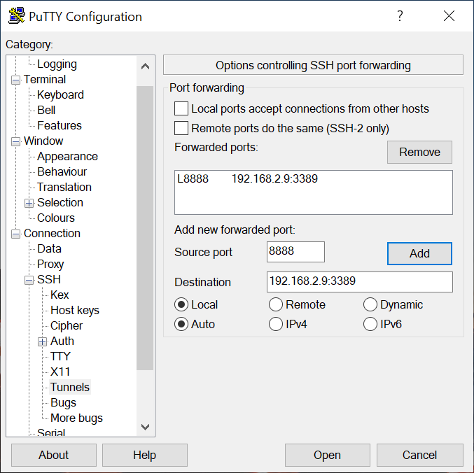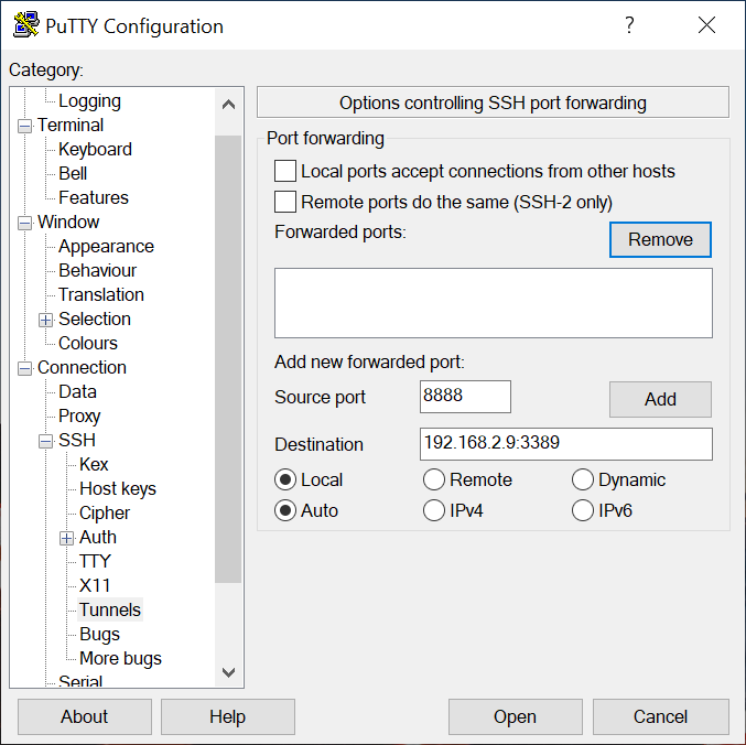 Connection > SSH > Tunnels: Provide the source port for the localhost RDP connection and destination (in the following format: private IP address of Windows VM:RDP port - as seen on the screenshot below).