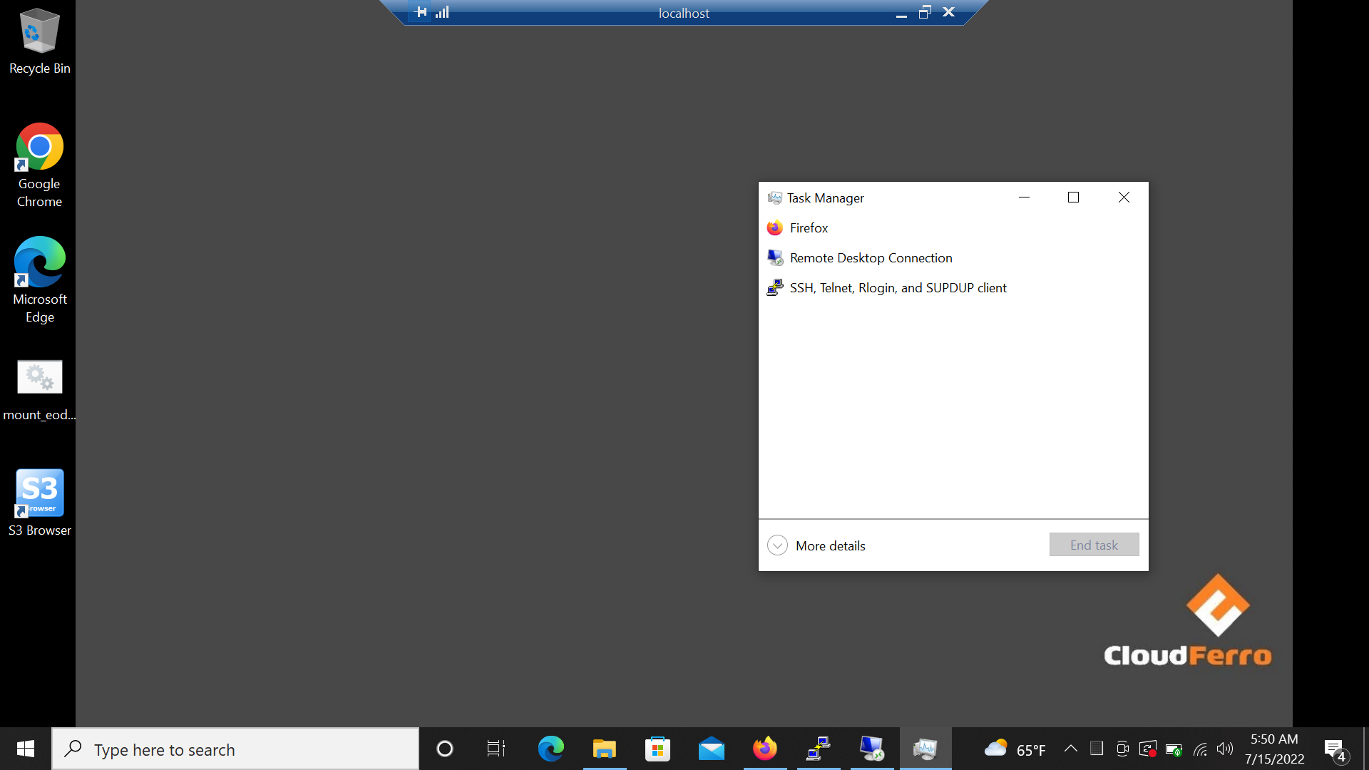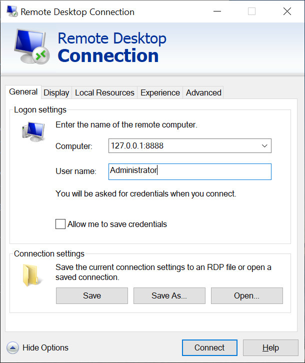 Step 3. Start an RDP session to localhost to reach the destination server🔗¶